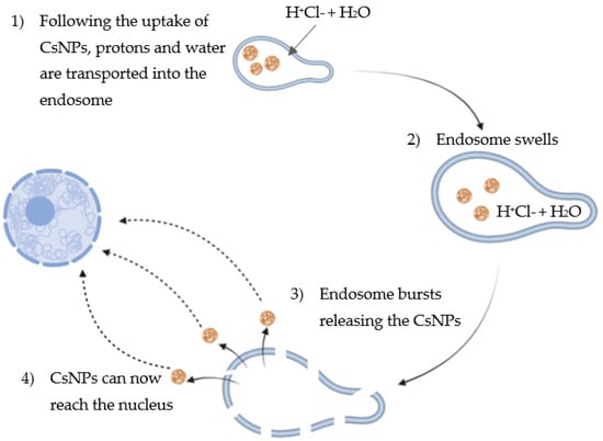 Graphical representation of the “proton sponge effect” following the uptake of CsNPs by the endosome: (1) protons are transported into the endosome along with chloride and water; (2) endosome swells; (3) endosome bursts releasing the CsNPs; and (4) CsNPs can now reach the nucleus.