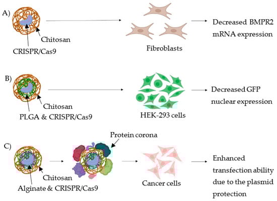 Strategies using pristine chitosan backbone. (A) Pristine CsNPs are used to transfect fibroblasts for the treatment of pulmonary arterial hypertension; results showed a decreased mRNA expression of the main gene, BMPR2, involved in the disease. (B) Chitosan is used as coating material of PLGA NPs complexed with CRISPR/Cas9; transfection of HEK-293 cells showed a decreased GFP nuclear expression. (C) Chitosan is used as coating material of alginate NPs complexed with CRISPR/Cas9; following formation of protein corona, treatment of cancer cells showed an enhanced transfection ability due to the plasmid protection from enzymatic degradation.