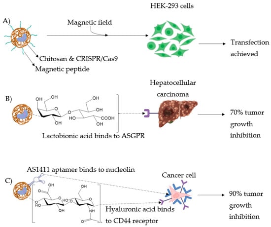 In the context of hepatocellular carcinoma (HCC) treatment, Zhang et al. [29] developed NPs based on Cs conjugated to β-galactose carrying lactobionic acid (La), which specifically targets HCC cells expressing the asialoglycoprotein receptor (ASGPR) on their cellular membrane (Figure 6B) [30]. Paclitaxel, a commonly employed anticancer drug was loaded into the NPs in conjunction with the single-guided vascular endothelial growth factor receptor 2 (sgVEGFR2)/Cas9 plasmid, to potentiate paclitaxel’s effect [31]. In vitro studies showed that the presence of La on the vector boosted the ability of NPs to preferentially accumulate within ASGPR-overexpressing cells. Moreover, the loaded NPs were able to downregulate the expression of VEGFR2 and NF-kB p65 in liver cancer cells, HepG2. In vivo studies performed on hepatoma mice model resulted in more than 70% inhibition of tumour growth following treatment with this novel system. The genome editing efficiency was up to 39% in vitro and 33% in vivo. Moreover, systemic distribution and biosafety evaluation of the novel chitosan-based NPs was assessed by labelling them with the fluorescent compound, Cy5.5. In the tumour site, the fluorescence signal gradually increased up to 24 h, suggesting prolonged blood circulation of the carrier and no significant side effects on normal organs and tissues such as heart, liver, or spleen [29].