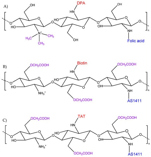 Strategies combining higher specificity and stability: (A) trimethyl chitosan modified with DPA and folic acid, (B) carboxymethyl chitosan modified with AS1411 aptamer and biotin, and (C) carboxymethyl chitosan modified with AS1411 aptamer and the transactivating transcriptional activator (TAT).