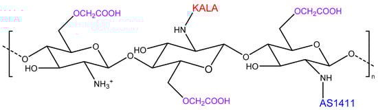 Similar to TMC, carboxymethyl chitosan (CmCs) is a widely used derivative of chitosan due to its improved solubility in a wide range of pH values. Indeed, carboxyl groups have a pKa of approximately 4.5, meaning that they become deprotonated, and hence negatively charged, at physiological pH, increasing the dissolution of CmCs. This effect is also given by the amino groups of chitosan that become protonated in the acidic tumour environment [54]. For this reason, CmCs is often employed in gene and drug delivery systems that require a pH-dependent response [13]. Moreover, carboxyl groups of CmCs can be further modified with other molecules or polymers to enhance the efficiency of the gene delivery system [55]. Regarding the delivery of the CRISPR/Cas9 complex, Liu et al. [56] generated a dual-targeting delivery system where the shell was composed of CmCs further functionalised with two molecules: biotin, a widely used target ligand of several tumour cells [57] and AS1411 (Figure 8B). The core of the vector was made of protamine sulphate, calcium carbonate, and calcium phosphate that co-precipitated with the CRISPR/Cas9 complex. In this study, the complex was directed against a cyclin-dependant kinase (CDK) overexpressed and overactive in tumour cells [58]. The results showed that the delivery of the plasmid to the nucleus of tumour cells led to a 90% reduction in the expression of the CDK and other proteins related to tumour development, such as Survivin. The same authors [59] developed another vector wherein CmCs was functionalised with AS1411 and a cell-penetrating peptide, transactivating transcriptional activator (TAT) to improve cellular uptake and endosome escape (Figure 8C) [60]. The CRISPR/Cas9 complex used was against the gene encoding β-catenin, a molecule involved in the proliferation, migration, and invasion of tumour cells. A successful knockout of the protein was observed, suggesting the ability of the vector to mediate genome editing in the nuclei of cancer cells.