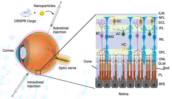 Delivery routes of CRISPR/Cas cargo to the mammalian retina. A representative illustration of the major delivery routes of CRISPR/Cas cargo to the retina represented by subretinal and intravitreal injections. The mammalian retina is divided into three main laminar layers: the outer nuclear layer (ONL), the inner nuclear layer (INL), and the ganglion cell layer (GCL). There are six different retinal neuronal cell types and one glial cell type distributed within the nuclear layers: the rod and cone photoreceptor nuclei are located in the ONL, whereas the nuclei of the bipolar (BC), horizontal (HC), amacrine (AC), and Müller (MG) cells are located in the INL. The cell bodies of the ganglion cells (GC) are located in the GCL. The processes of the different cells are extended into two plexiform layers. Processes from the photoreceptor cells are extended into the outer plexiform layer (OPL) to form synapses with the retinal neurons. Processes from the bipolar, horizontal, amacrine, as well as Müller cells are extended into the inner plexiform layer (IPL). The axons of the ganglion cells are directed into the optic nerve through the nerve fibre layer (NFL).