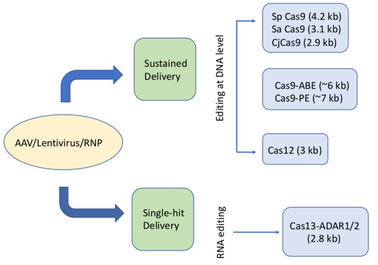 Different Cas-related proteins and their main characteristics for potential use in CRISPR-based gene therapies. A schematic diagram showing the different classes of Cas proteins used to target/edit retinal cells with their relative sizes. The current delivery platforms used with the CRISPR/Cas cargo are AAV, lentivirus, and ribonucleoproteins (RNPs). CRISPR editing can be achieved either in a sustained delivery acting on DNA or as a single-hit even acting on RNA.