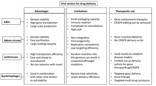 Viral-based delivery vectors. Schematic diagram showing the advantages, limitations, and therapeutic uses of the four main viral-based vehicles for CRISPR-reagents delivery: AAVs, Adenoviruses, Lentiviruses, and Bacteriophages.