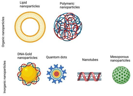 Types of nanoparticles. Schematic diagram showing the different types of nanoparticles, which can be classified into two categories: Organic nanoparticles, including lipid and polymeric particles; and inorganic nanoparticles, including gold nanoparticles, quantom dots, nanotubes, and mesoporous nanoparticles.