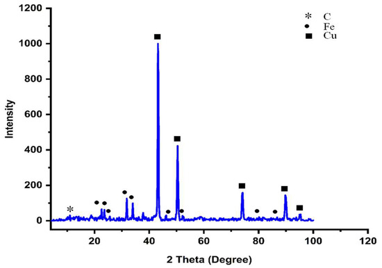 XRD analysis is the best and fastest tool for material identification according to its standard indexed planes [15,38,39,40]. There is a tip peak at 2 θhkl = 11° with d-spacing = 0.8043 nm, which conforms to a graphitic content at hkl Miller plane index (001) for carbon skeleton [41]. The existence of this peak was attributed to an organic content that resulted after NC calcination at 350 °C [15,39,40]. XRD showed mixture planes that were dedicated to the iron and copper nanoparticles according to the reference cards ICDD # 00-431-3213, and 00-901-2043, respectively, of the face center cubic crystallographic system [38]. The reflection peaks (2θhkl) were determined as 22.6°, 23.6°, 25.6°, 31.8°, 34.0°, 37.8°, 46.2°, 52.2°, 80.2°, and 86.8° for iron that identically corresponded to hkl Miller indices of 200, 004, 022, 220, 222, 400, 240, 0410, and 448. However, the reflection peaks (2θhkl) that distinguished copper were 43.2°, 50.4°, 74.2°, 89.8°, and 95.4° with Miller indices of 111, 200, 220, 311, and 222, which were agreed with the previously reported approaches [12,38,42,43,44]. Figure 1 shows that the main peaks were sharp, indicating the high crystallinity of the formed NC [15,40,45]. The diffractogram demonstrated no interference peaks, except for the dedicated peaks to the main components of the NC, confirming the purity of any other oxides [38,40,42]. According to the intensities, the main component of the NC was copper, where carbon and iron acted as a cover coating that prevented copper from oxidation [38,40,42,43,44,46]. Thus, the formed NC could be identified as a C@Fe@Cu nanosystem. The average crystallite size (Dscherrer) was estimated, and it was found to be 12.5 nm. Table 1 shows the detailed XRD calculations of the formed C@Fe@Cu NC.