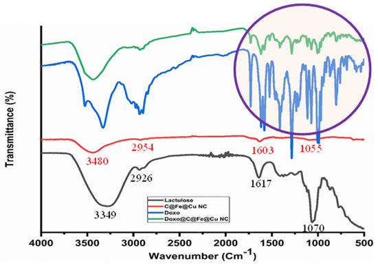 FTIR spectra of Lactulose, C@Fe@Cu NC, DOX, and DOX loaded C@Fe@Cu NC.