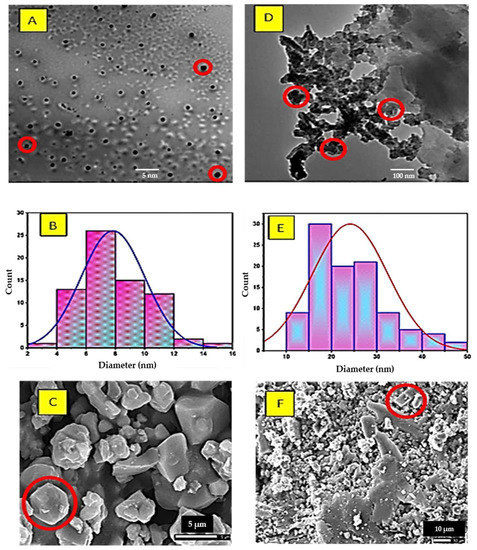 TEM and SEM analysis of the C@Fe@Cu NC before and after DOX loading are shown in Figure 3A,C,D,F. The nanoscale integrity of the produced NC was confirmed by TEM and SEM examinations on particles with a size range of 3.9–48.7 nm [40,43,46], where the particle sizes were found to be 7.8 and 24.1 nm before and after DOX loading, respectively. The images assured the crystallographic system that was determined via XRD analysis, where it matched the cubic (red circles) and spherical shapes. When DOX was added to the mixture, the particle size increased significantly, which may be due to the adsorption process [38,40,43]. Moreover, the crystallinity index before and after DOX loading was calculated, and it was noted that it took the behavior toward the polydispersibility nature as 0.4 to 1.1, respectively [14,38,40]. This could be interpreted as an encapsulation process that acted as a coating of the C@Fe@Cu NC system. This may be attributed to the microporous nature of the formed NC (shown in SEM images) [42,43,44,46].