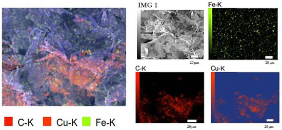 Moreover, the carbon presence was confirmed by mapping morphology analysis. Figure 4 shows the distribution of the main component elements of the formed nanocomposite, as it was suggested as a C, Fe, and Cu skeleton. This finding was in line with XRD and FTIR results.