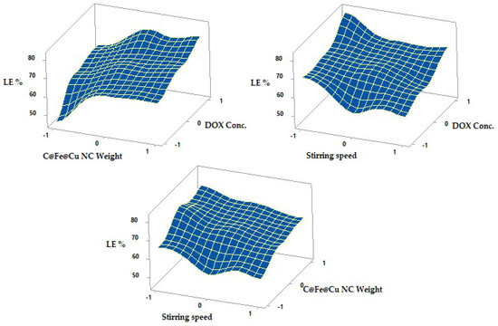 Using a 3-D plot (Figure 8), LE percentage increased from 45.87 ± 2.03 to 64.32 ± 2.08 and from 70.25 ± 2.21 to 82.11 ± 3.23 at lower and higher DOX concentrations with a constant C@Fe@Cu NC weight and stirring speed. Higher DOX concentrations promote drug adsorption and incorporation on the surface of C@Fe@Cu NC, leading to higher LE and DOX conc. After forming stable C@Fe@Cu NC, DOX can be adsorbed onto the surface of C@Fe@Cu NC in the second main step. The LE percent of nanocomposites produced is significantly influenced by these two stages. Similar results were observed when biodegradable sorafenib was put into carbon nanotubes to treat hepatocellular cancer [1].