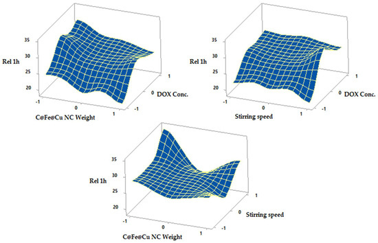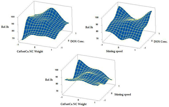 Results of fitting a multiple linear regression model for the correlation between DOX conc., C@Fe@Cu NC weight, and stirring speed, and % drug release after one or three hours are shown in Equations (12) and (13).
