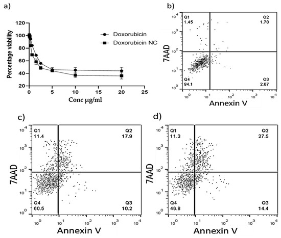 MTT assay demonstrating the viability of HEPG2 cells treated with various doses of DOX and DOX NC (a); Analysis of flow cytometry shows how frequently cells treated with control growth media go into apoptosis (b); DOX (c); and DOX-NC (d).