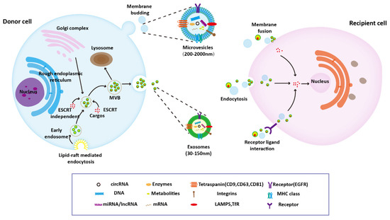 Several stages—including endocytosis, endosome and MVBs formation, and exosomes release—are involved in the formation of exosomes [19]. Although the exact process remains unclear, the biogenesis of exosomes has been investigated. First, the lipid raft domain of the plasma membrane forms early endosomes through the endocytosis pathway. With the assistance of the Golgi complex, these early endosomes mature into late endosomes, the bilayer membrane of which produces vesicles that accumulate in the lumen [20]. Both endosomal sorting complex required for transport (ESCRT)-dependent and ESCRT-independent pathways are involved in the process of MVBs formation [21,22]. MVBs then fuse with the plasma membrane to release exosomes or fuse with lysosomes and then degrade [23]. Once MVBs have fused with the plasma membrane, intraluminal vesicles are released into the extracellular environment.