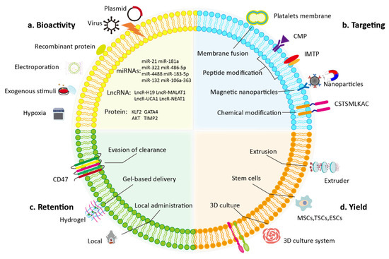 Heart disease is a major cause of death worldwide, especially among aging populations. Approximately 17.8 million deaths globally in 2017 were caused by heart disease [1]. Thus, effective therapy for cardiac repair is required. Extracellular vesicles (EVs), nanoscale small vesicles, are secreted by many types of cells and play a key role in intercellular communication [2,3]. “EVs” is a collective term for various subtypes of membrane components released by cells, including exosomes (30–150 nm), microvesicles (200–2000 nm), and apoptotic bodies (1–10 μm) [4]. EVs contain abundant cargo such as proteins, nucleic acids, and lipids [5,6,7]. Compared with parental cells, EVs retain the function of the host and also have the advantages of low immunogenicity, long-term stability, easy storage, and biocompatibility [8,9]. EVs can easily diffuse to the blood, penetrate tissues through the circulatory system, and even cross the blood–brain barrier [10]. Therefore, developing novel strategies to optimize such cell-free nanoparticles could profoundly affect clinical practice.