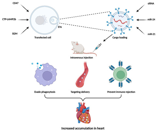 Kim and colleagues designed HEK-293 cells expressing cardiac-targeting peptide (CTP) fused to LAMP2b and then isolated EVs from the cell culture medium [111]. The EVs were loaded with an siRNA that targeted the receptor for advanced glycation end products (siRAGE). The modified EVs exhibited twice the siRAGE delivery efficiency of normal EVs and significantly attenuated cardiac inflammation levels in experimental autoimmune myocarditis. In another study, CD47-modified EVs were designed to solve the rapid clearance of EVs by the mononuclear phagocyte system [112]. Binding of CD47 and SIRPα results in a “do not eat me” signal, which helps cancer cells to evade phagocytosis [113]. EVs were generated from MSCs overexpressing CD47 and then loaded with miR-21a via electroporation. After being injected into an ischemia–reperfusion mouse model, the engineered EVs preferentially accumulated in the heart and significantly reduced the apoptosis and inflammation levels of injured cardiomyocyte. It is an attractive strategy to prevent immune rejection of EVs through modulating EVs’ imprinting. Shao et al. isolated exosomes from β2-microglobulin (B2M)-deficient MSCs and loaded miR-24 into exosomes through electroporation [114]. The modified exosomes were able to restore cardiac function by inhibiting cardiac fibrosis in a rat model of myocardial infarction.