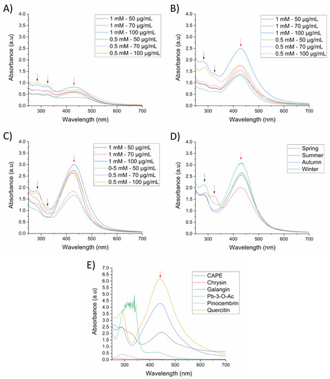 UV-Vis spectra of SP-AgNPs at different synthesis conditions (AgNO3—Propolis extract). (A) 25 °C and 1 h reaction time; (B) 70 °C and on 1 h reaction time; (C) 70 °C and 2 h reaction time; (D) seasonal samples of SP-AgNPs; (E) AgNPs synthesized with propolis chemical constituents. The concentration of seasonal samples of SP and all chemical constituents used for the synthesis of AgNPs was 100 µg/mL, except for quercetin (20 µg/mL). Synthesis was carried out with 1 mM AgNO3 at 70 °C for 2 h. Black arrows (spectral bands at 280 and 330 nm of SP); red arrows (LSPR of silver nanoparticles). Pb-3-O-Ac: Pinobanksin-3-O-acetate. Spectra are representative of three independent experiments.