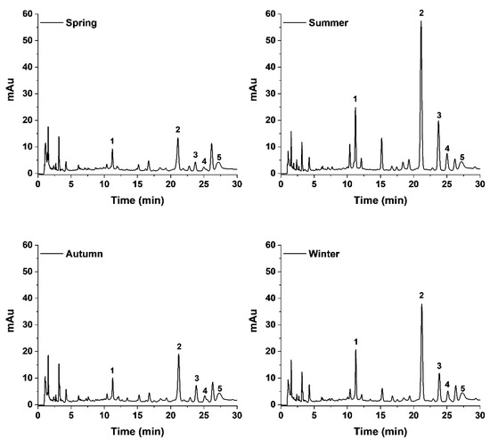 To further understand the role of the propolis chemical constituents in the synthesis of AgNPs, we evaluated the main chemical markers of the propolis samples (pinocembrin, pinobanksin 3-O-acetate, galangin, chrysin and quercetin), as well as CAPE, which has previously been reported in Sonoran Desert propolis as a highly active molecule [19]. There was no formation of AgNPs using pinocembrin and chrysin as reducing agents, while CAPE and Pb-3-O-Ac produced AgNPs with low absorption of the LSPR, demonstrating its poor reduction capacity (Figure 1E); it is noteworthy that the spectrum of Pb-3-O-Ac was above the detection limits of the equipment, due to its high concentration, nevertheless the LSPR of the formed AgNPs was too low. On the other hand, galangin and quercetin demonstrated a high reducing power, as observed by the high intensity of the LSPR, especially quercetin, which required a lower concentration for AgNPs synthesis (20 µg/mL) compared to the other constituents (100 µg/mL). Furthermore, changes in the polyphenolic profile of seasonal samples of propolis upon the synthesis of the AgNPs were determined using HPLC-UV-DAD. We can observe in Figure 2 that the chromatogram of the supernatant of the four seasonal samples of SP-AgNPs are similar to those previously reported for these SP seasonal samples [15]; we identified the presence of quercetin (1), as well as the presence of the four compounds previously reported (pinocembrin [2], Pb-3-O-Ac [3], chrysin [4], and galangin [5]). A proportion of the main components of SP were retained upon the synthesis of AgNPs when we compared this to the previously reported profile of SP.