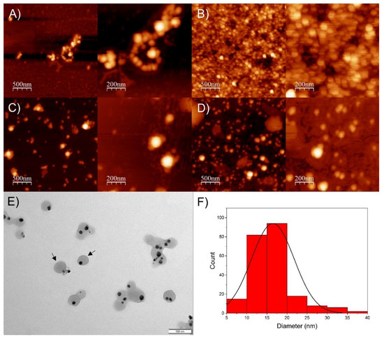 Atomic force microscopy and transmission electron microscopy of seasonal samples of SP-AgNPs. (A) Spring SP-AgNPs; (B) Summer SP-AgNPs; (C) Autumn SP-AgNPs; (D) Winter SP-AgNPs; (E) TEM image of winter SP-AgNPs, and (F) histogram of winter SP-AgNPs from TEM images. Black arrows: SP-AgNPs surrounded by propolis extract.