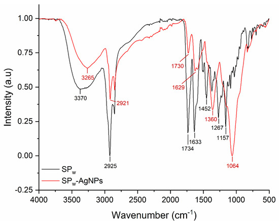 FT-IR spectra of SPw (black line) and SPw-AgNPs (red line).