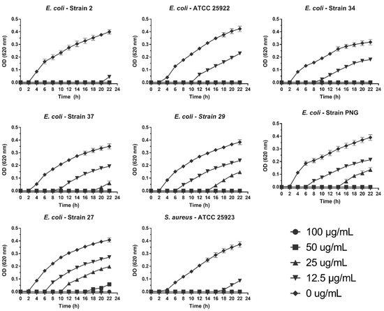 We determined the effect of the treatments on the growth curve of the analyzed clinical isolates. Interestingly, a delay of 6 to 21 h was observed in the microbial growth curve of all pathogens evaluated at concentrations lower than the MIC. This was most noticeable in E. coli strain 2, with a 21-h delay at 12.5 µg/mL (Figure 5).