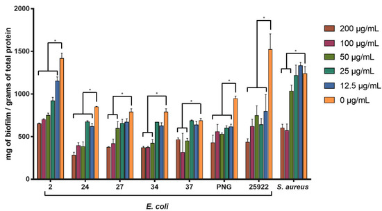 The activity of SPw-AgNPs against pre-formed biofilm was evaluated for all our clinical isolates and ATCC models at 24 h of treatment (200–12.5 μg/mL). SPw-AgNPs were capable of significantly reducing the biomass of biofilms at the lowest tested concentration (12.5 μg/mL) for the strains of E. coli 2, 24, PNG, and ATCC 25922; nevertheless, higher concentrations of SPw-AgNPs were needed to observe significant differences in the reductions of the biofilm biomass for strains E. coli 27, 34, 37, and S. aureus ATCC 25923, compared to the untreated control (Figure 6).