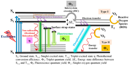 Cancer is a significant civic health problem, accounting for almost 10 million deaths per annum globally [1,2,3]. The existing traditional methods for cancers are surgery and chemo/radiotherapy, which have numerous side effects and poor biological barriers [4,5,6]. For this reason, huge efforts are currently being made to enhance modern approaches with both highly specific therapeutic efficacy and minimal side effects in healthy cells. The near-infrared (NIR)-based photo-ablation therapies comprising photodynamic therapy (PDT) and photothermal therapy (PTT) are emerging as important cancer therapies because of their non-invasive character combined with less cytotoxicity, multi-drug resistance, and minimum harm to healthy cells. Moreover, phototherapies can act together with other modal therapies, namely chemo-, gene-, and immunotherapy, to reduce side effects and develop a supreme way of healing for patients [7,8,9,10,11,12]. Figure 1 exhibits the mechanisms of photodynamic therapy once the photosensitizers (PSs) have been treated for NIR irradiation with a suitable wavelength range. Initially, electrons are excited from the S0 (ground state) to the excited S1 (singlet state) by the absorption of NIR, and then follow the three pathways: (i) return from the S1 to S0 via non-radioactive emission in the form of heat, (ii) return from the S1 to S0 via radioactive emission, in between the surface strap states present due to surface impurities, defects, and functional groups, and the sub-sequential development of fluorescence, and (iii) conversion starting from the S1 to the excited T1 triplet form via intersystem crossing (ISC). Finally, from the T1 to S0 ground state, free radicals are generated via electron transformation to create reactive oxygen species (ROS) [13]. The increasing level of ISC can also increase T1, which is useful for sensitizing O2 to provide 1O2 and develops the PDT effect [14]. To date, many organic PSs have been reported, namely Phthalocyanine [15], hypocrellin [16,17], and porphyrin [18], which have been utilized in PDT for cancer. Moreover, the reported organic PSs have been restricted due to water insolubility, aggregation, less specificity to tumor cells, and side effects in healthy cells [19,20,21]. Along with organic PSs, metal and semiconductor-based nanomaterials have been reportedly used in PDT with strong absorbance and expressed high photothermal transfer efficiency. The heavy cytotoxicity of metal ions restricts their usage in clinical trials [22,23,24]. As a result, the growth of new nanomaterials is necessary for use in PDT for cancer treatment.