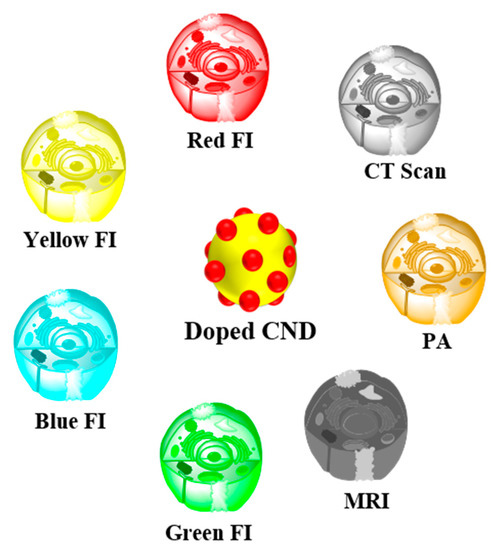 The fluorescent nature of CNDs is very adaptable for direct application in optical imaging. Owing to the occurrence of various emissive levels, CNDs exhibit excitation-based PL. This excitation-based PL property can be utilized to obtain multicolored images of cancer cells. CNDs exhibiting different color emissions with doped elements have been used for fluorescence imaging for PDT. Fluorescence imaging (FI) includes various imaging methods namely, magnetic resonance imaging (MRI), computed X-ray tomography (CT scan), and photoacoustic (PA) imaging, which have different ranges of imaging depths, spatial resolutions, and sensitivities, and all of them are generally applied for the earlier diagnosis of cancer and pre-clinical proposes (Figure 3) Multimodal bio-imaging can combine the benefits of individual imaging modalities, which results in more accurate statistics for therapy design and for guiding therapeutic models [119]. With the aim of enhancing the sensitivity and accuracy of cancer diagnoses, the synthesis of the doped CNDs with multimodal bio-imaging capabilities is highly recommended. General multimodal bio-imaging of CNDs comprises MR/FI, PA/FI, and CT scan/FI.