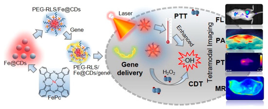 Graphical representation of the iron-doped carbon dots as a theranostic agent for PTT, gene delivery, and multimodal (MR/PA/PT/FI) imaging-guided PTT/chemodynamic therapies. Reproduced with permission [129]. Copyright 2021, Elsevier.