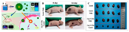 (A) Graphical representation of Cu,N-CDs with multimodal theranostics of combined PTT/PDT of mouse melanoma (B16) cells. (B) Photographic images of tumor-bearing mice with laser treatment on different days. (C) Corresponding photographs of tumors in the blank group (Blank without treatment), control groups (only Cu,N-CDs without laser and Laser only applied without Cu,N-CDs), and test group (Cu,N-CDs + Laser). In test group, significant reduction in the tumor size observed, while both control test group (Cu,N-CDs and Laser only) no effect is observed in the tumor size in comparison with blank group. Reproduced with permission [154]. Copyright 2018, Elsevier.
