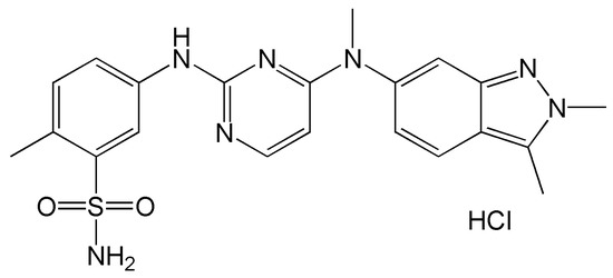 PZH is classified as a BCS Class II crystalline solid powder that exhibits poor water solubility, high permeability, and low oral bioavailability of 14–39% [3]. The maximum daily dose (MDD) for the commercial product (Votrient, Novartis, Basel, Switzerland) is large enough to reach 800 mg [4]. This high dose has a correlation with hepatotoxicity and is a burden for patients; hence, the MDD should be mitigated with any alternative formulations [5]. PZH is expected to show a highly pH-dependent solubility since it has basic structural groups such as pyrimidine and sulfonamide, as shown in Figure 1 [6]. This pH-dependent solubility of PZH is expected to cause dissolution variability according to the medium pH [7,8]. Thus, there is a need to develop PZH formulations that enable enhanced solubility and dissolution rate regardless of medium pH.