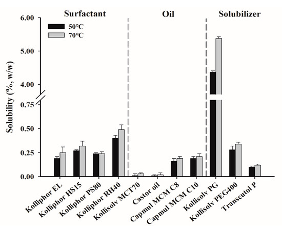 A PZH solubility test was performed at 50 °C and 70 °C to select a suitable surfactant, oil, and solubilizer for the composition of SNEDDS in Figure 2. The solubility at 70 °C was overall higher than that at 50 °C [30]. Among the solubilizers, the solubility of PZH in Kollisolv PG was the highest at 70 °C with 5.38 ± 0.05% (w/w), which was about 16-fold higher than that in Kollisolv PEG400 (0.34 ± 0.02%). Kollisolv PG was effective as a solubilizer since it showed the highest solubility. Among the surfactants, Kolliphor RH40 (0.49 ± 0.05%) showed relatively higher solubility than Kolliphor HS15 (0.32 ± 0.05%) and Kolliphor EL (0.25 ± 0.06%). Among the oils, Kollisolv MCT70 and castor oil showed a negligibly low solubility of <0.1%. Capmul MCM C8 and Capmul MCM C10 showed relatively higher solubility of 0.19 ± 0.02% and 0.21 ± 0.03%, respectively, with no significant difference between them. Therefore, Kollisolv PG as a solubilizer, Kolliphor RH40 as a surfactant, and Capmul MCM C8 and Capmul MCM C10 as oils were selected for further studies on the basis of solubility.