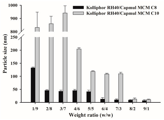 TwCV without PZH was characterized to select the appropriate oil between Capmul MCM C8 and Capmul MCM C10, as well as the suitable weight ratio for use (Figure 3). Capmul MCM C8 and Capmul MCM C10 were mixed with Kolliphor RH40 at a weight ratio of 1/9–9/1, and the particle size of dispersion was measured. In most TwCVs, as the weight ratio of surfactant increases, the particle size tends to decrease [31]. All TwCVs containing Capmul MCM C8 showed particle sizes of <150 nm. TwCVs containing Capmul MCM C10 showed a relatively larger particle size than those containing Capmul MCM C8 at the weight ratios of 1/9–7/3, but a similarly small particle size of <50 nm at the weight ratios of 8/2–9/1. The longer length of the carbon chain (C10 vs. C8) in Capmul MCM C10 would produce a more viscous vehicle, resulting in a larger particle size dispersion at most weights as compared to Capmul MCM C8. However, at the weight ratios of 6/4–9/1, both Capmul MCM C8 and Capmul MCM C10 showed a suitable particle size of <150 nm and almost transparent dispersion (not shown). Therefore, the TwCVs containing Kolliphor RH40 (surfactant) and Capmul MCM C8 and Capmul MCM C10 (oil) were selected at higher surfactant ratios of 6/4–9/1.