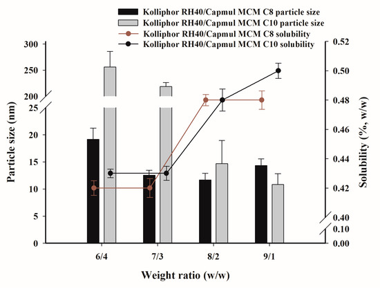 The saturation solubility of PZH and the particle size of dispersion were measured at the selected TwCV composition, as summarized in Figure 4. It was found that the saturated solubility of PZH was higher at weight ratios of 8/2 and 9/1 due to the higher solubility of surfactant (Kolliphor RH40) compared to oils (Capmul MCM C8 and C10), as shown in Figure 2. The solubility of PZH at 9/1 was 0.50 ± 0.01% for Kolliphor RH40/Capmul MCM C10 and 0.48 ± 0.01% for Kolliphor RH40/Capmul MCM C8. Kolliphor RH40/Capmul MCM C10 at 6/4 and 7/3 showed a slight increase in particle size (>200 nm) compared to the TwCV (<150 nm) due to the PZH loading [6]. However, a small particle size of <50 nm was observed at 8/2 and 9/1. For Kolliphor RH40/Capmul MCM C8, the particle size of dispersion was small (<50 nm) at weight ratios of 6/4–9/1, and there was no effect of PZH loading on the particle size. As a result, the TCS composed of Kolliphor RH40/Capmul MCM C8 and Kolliphor RH40/Capmul MCM C10 showed a small particle size and relatively high PZH loading at a weight ratio of 9/1; thus, it was subsequently used for the preparation of the FCS.