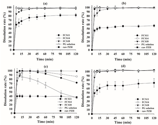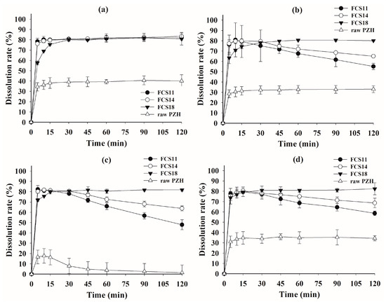 Dissolution profiles of FCS formulations and raw PZH in pH 1.2 buffer (a), pH 4.0 buffer (b), pH 6.8 buffer (c), and water (d).