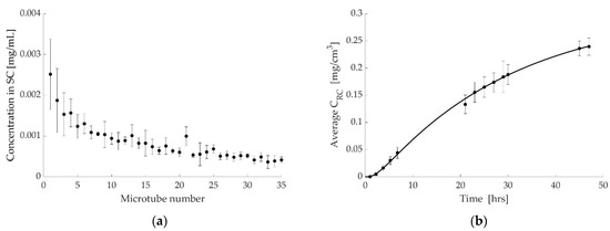 Figure 5b,c show the results from the permeation study (marked with circles), along with the simulated release curve, and the simulated drug concentration profiles, respectively. The same method, as explained previously, is used for estimating the value for P1. In this case, the simulated amount of drug is between 0.016 mg (at a depth of 0.0035 cm) and 0.032 mg (at a depth of 0.0070 cm), which matches well with the experimental result of 0.022 mg.
