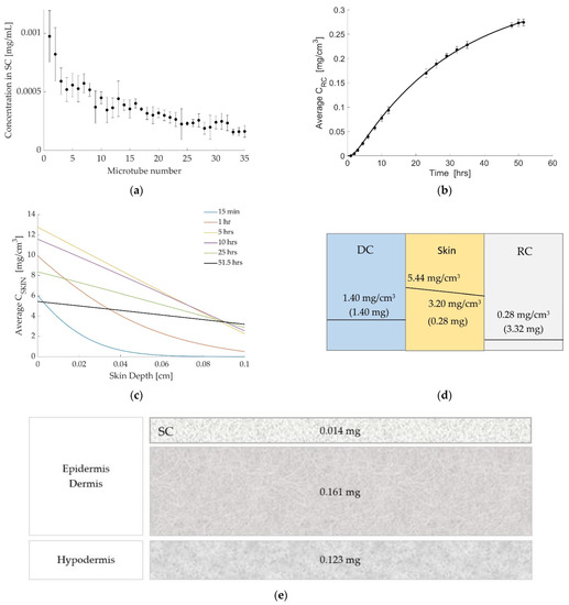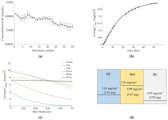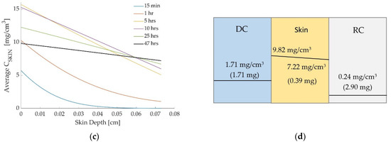 As the drug increases in the RC, it decreases in the DC and the amount is calculated by the numerical model at each time. Figure 3d shows the discontinuity between layers schematically and gives the drug concentration in the DC at the end of the simulation (47 h), along with concentration values for the skin and the RC (same values as in Figure 3b,c) and the amount of drug in each layer.
