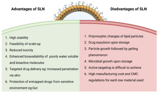 Solid lipid nanoparticles (SLNs) were designed in the early 1990s as an alternative nanomedicine to other lipid-based carriers [1,2,3,4,5]. SLN dispersions are identical to oil in water emulsions, but the liquid lipid of the emulsion is replaced by a solid lipid (at room temperature), which can hold both hydrophilic and hydrophobic drugs [6]. SLNs offer distinctive advantages such as protecting active pharmaceutical ingredients, enhanced bioavailability, and increased penetration upon topical application [7,8]. There are several cosmetic products available on the market based on these attributes [9]. At the same time, SLNs face challenges such as polymorphic changes of lipid components, drug leakage and microbial growth upon storage. Despite several products being available on the cosmetics side, there are hardly any clinical trials active in the clinical trial database for other applications. One of the main reasons we assume for this is that the cosmetic regulations are often not as stringent as drug products. The advantages and disadvantages of SLNs are summarized in Figure 1.