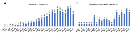Bibliographic search analysis of SLNs from the PubMed database [19]. Search term “Solid lipid nanoparticles [Title/Abstract]” (A) yielded 3143 publications; “Scale-up of solid lipid nanoparticles [Title/Abstract]” yielded 62 publications (B).