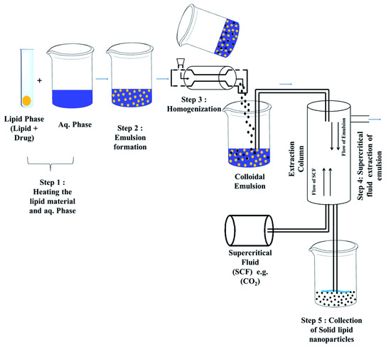 The progress on conventional methods, characterization, and applications is reviewed in published reports [15,16,17]. Paliwal et al. reviewed recent research publications and patents of SLNs. In addition, authors discussed the controlled and targeted drug delivery applications of SLNs [15]. A recent review by Akbari et al. focused on manufacturing methods of SLNs, routes of administration and their applications in gene and peptide delivery systems. Moreover, the review covered regulatory status, commercialization plan and safety of SLNs [16]. Duan et al. reviewed physicochemical characterization, materials and methods used for the production of SLNs. Furthermore, challenges of stability, storage conditions and their applications are also well documented [17]. Researchers explored SLNs for therapeutic indications delivered using different routes of administration [16,18]. However, there is a need for information specific to the scale-up methods of SLNs.
