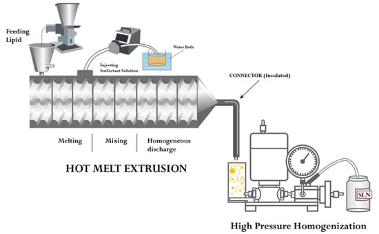Schematic representation of continuous SLN synthesis using HME-connected HPH. Reproduced with permission from Ref. [54]. Copyright 2014, Elsevier.