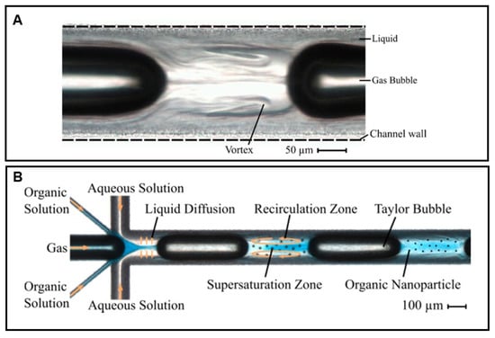 A microscopic view of a transparent microchannel showing vortices in the segmented gas-liquid flow (A) and microfluidic system with initial flow-focusing and subsequent Taylor flow (B) Reprinted from Ref. [58].