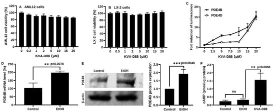 Figure 1. KVA-D88 selectively inhibits PDE4B activity. (A,B) Cell viability of AML 12 and LX-2 cells after 48 h treatment with KVA-D88 as determined by MTT assay. (C) Dose-dependent activities of PDE4B and PDE4D after treatment with KVA-D88 as determined by CRE luciferase assay. The fold induction of luminescence indicated the inhibitory efficacy. (D,E) PDE4B mRNA and protein expression in AML 12 cell line after 50 mM EtOH treatment for 48 h. (F) Intracellular cAMP level after 50 mM EtOH treatment for 48 h with or without 10 μM KVA-D88. Results are presented as the mean ± S.D. (n = 3). ** p < 0.01, *** p < 0.005, and ns p > 0.05.