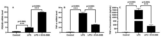 Chronic alcohol exposure is known to increase lipopolysaccharide (LPS) leakage from the gastrointestinal tract [18]. LPS is the major component of the outer membrane in gram-negative bacteria and stimulates hepatic Kupffer cells. Activated Kupffer cells and relevant inflammatory response are the dominant factors in ALD progression [19,20]. It is well-studied that PDE4 regulates inflammation via the degradation of cAMP [21]. To determine the anti-inflammatory potential of KVA-D88, macrophage-like RAW 264.7 cells were pretreated with KVA-D88 and stimulated with LPS. The mRNA expression level of PDE4B in macrophages was significantly upregulated by LPS (Figure 2A). The LPS stimulation markedly raised the mRNA expression level of proinflammatory cytokine TNF-α in macrophages, while KVA-D88 treatment decreased TNF-α mRNA level (Figure 2B). ELISA assay revealed that KVA-D88 also suppressed LPS-induced TNF-α secretion from macrophages (Figure 2C). Our results indicate that KVA-D88 exhibited an anti-inflammatory effect by suppressing the secretion of proinflammatory cytokine TNF-α.