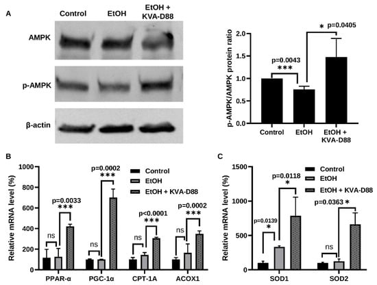 Figure 3. KVA-D88 promotes the expression of genes and proteins related to β-oxidation and antioxidants. AML 12 cells were treated with 50 mM EtOH for 48 h with or without 10 μM KVA-D88. (A) Western blot of AMPK and p-AMPK. (B) mRNA expression level of PPAR-α, PGC-1α, CPT-1A, and ACOX. (C) mRNA expression level of SOD1 and SOD2. Results are presented as the mean ± S.D. (n = 3). * p < 0.05, *** p < 0.005, and ns p > 0.05.