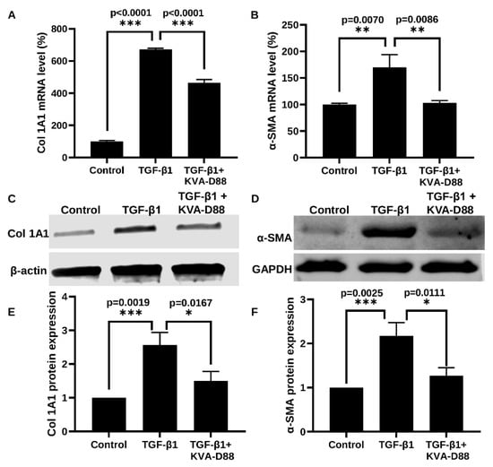 Figure 4. KVA-D88 inhibits profibrotic genes and relative protein expression. LX-2 cells were stimulated with 2.5 ng/mL TGF-β1 for 24 h with or without 20 min preincubation of 10 µM KVA-D88. (A,B) Col 1A1 and α-SMA mRNA expression as determined by real time RT-PCR. (C,D) Collagen 1A1 and α-SMA protein expression as determined by Western blot analysis and their quantification of blot bands (E,F). Results are presented as the mean ± S.D. (n = 3). * p < 0.05, ** p < 0.01 and *** p < 0.005.