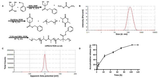 Figure 5. Preparation and characterization of KVA-D88 loaded nanoparticles. (A) Synthesis of mPEG-b-P(CB-co-LA). (B) Particle size distribution of KVA-D88 loaded nanoparticles. (C) Zeta potential of KVA-D88 loaded nanoparticles. (D) Release profile of KVA-D88 loaded nanoparticles in PBS. Results are presented as the mean ± S.D. (n = 3).