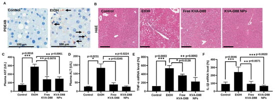 Figure 6. KVA-D88 loaded nanoparticles alleviate alcohol-induced liver injury and inflammation after systemic administration into mice. (A) Representative microscopic pictures of IHC staining for PDE4B. PDE4B expression was upregulated in mice liver by alcohol diet. Scale bars (120×), 100 μm. (B) Representative microscopic pictures of H&E staining of mice liver tissue. Scale bars (20×), 200 μm. (C,D) Mice plasma AST and ALT levels. (E,F) Mice hepatic mRNA expression level of TNF-α and IL-1β. Results are presented as the mean ± SD (n = 3). * p < 0.05, ** p < 0.01 and *** p < 0.005.