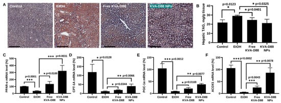 Steatosis is one of the most common and characterized stages during ALD [25]. Oil red staining estimated that alcohol feeding resulted in acute steatosis with extensive deposition of oil droplets in the liver. KVA-D88 loaded NPs dramatically reduced hepatic lipid accumulation to the level of the control group (Figure 7A). Triglyceride (TG), also known as triacylglycerol (TAG), is the principal constituent of fat accumulated in the liver [6,35,38]. The level of hepatic TAG further confirmed that alcohol feeding induced steatosis while KVA-D88 loaded NPs significantly ameliorated alcohol-induced fat aggregation (Figure 7B). It is reported that chronic alcohol intake leads to steatosis by promoting hepatic lipogenesis and suppressing fatty acid β-oxidation [25,39]. To investigate whether KVA-D88 could promote β-oxidation in vivo, we measured the expression level of PPAR-α, PGC-1α, CPT-1A, and ACOX1 [40,41,42]. Incoherent with other studies, alcohol notably downregulated the expression of these genes. However, the downregulation of PPAR-α, PGC-1α, CPT-1A, and ACOX mediated by alcohol was greatly reversed by KVA-D88 loaded NPs (Figure 7C–F). These data suggest that KVA-D88 NPs could effectively ameliorate alcohol-related steatosis via promoting the expression of key genes regulating hepatic β-oxidation.