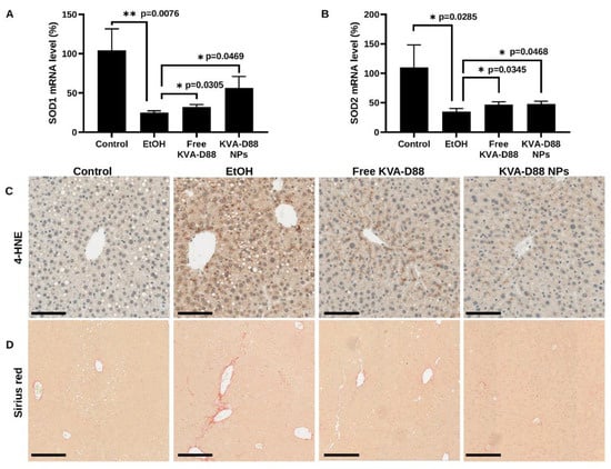 Figure 8. KVA-D88 loaded nanoparticles alleviate alcohol-induced oxidative stress and fibrosis after systemic administration into mice. (A,B) Mice hepatic mRNA expression levels of SOD1 and SOD2. Results are presented as the mean ± SD (n = 3). * p < 0.05 and ** p < 0.01. (C) Representative microscopic pictures of IHC staining for 4-HNE. (D) Representative microscopic pictures of Sirius red staining of mice liver tissue. Scale bars (20×), 200 μm.