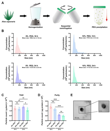 Isolation of PDEVs from Aloe saponaria peels. (A) Schematic illustration of EV isolation procedure from Aloe saponaria. (B) Size distribution of AS-EVs precipitated for the indicated time using 8% and 16% PEG solutions, as determined by NTA. In all cases, AS-EVs showed a heterogenous size distribution, and the mean size was found to be less than 200 nm. (C) Yield of AS-EVs for each precipitation condition. The yield was determined by dividing the total count of isolated vesicles by the mass of Aloe saponaria extract (* p < 0.05, ns: not significant, n = 5). (D) Purity of AS-EVs for each precipitation condition. The purity is represented as the count of particles-to-microgram of total protein (** p < 0.01, *** p < 0.005, ns: not significant, n = 5). (E) Transmission electron microscopy image of isolated AS-EVs.